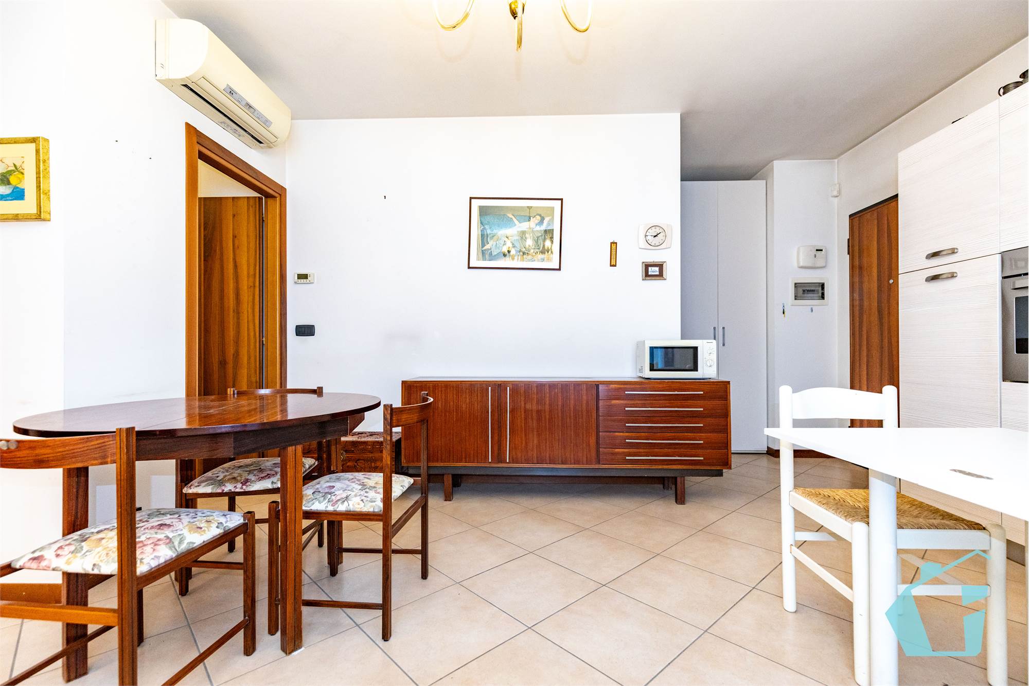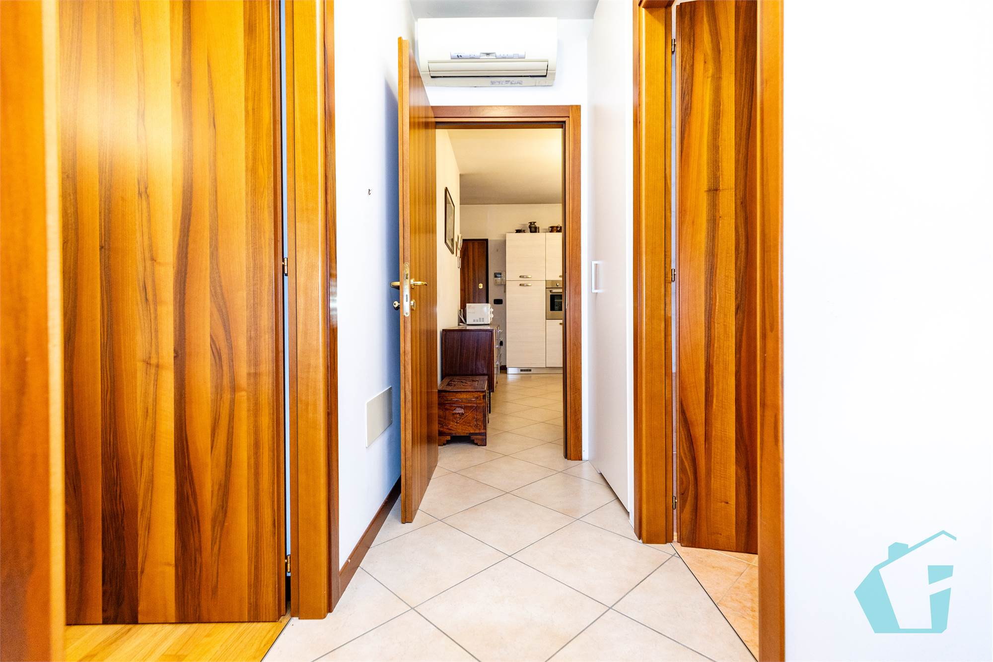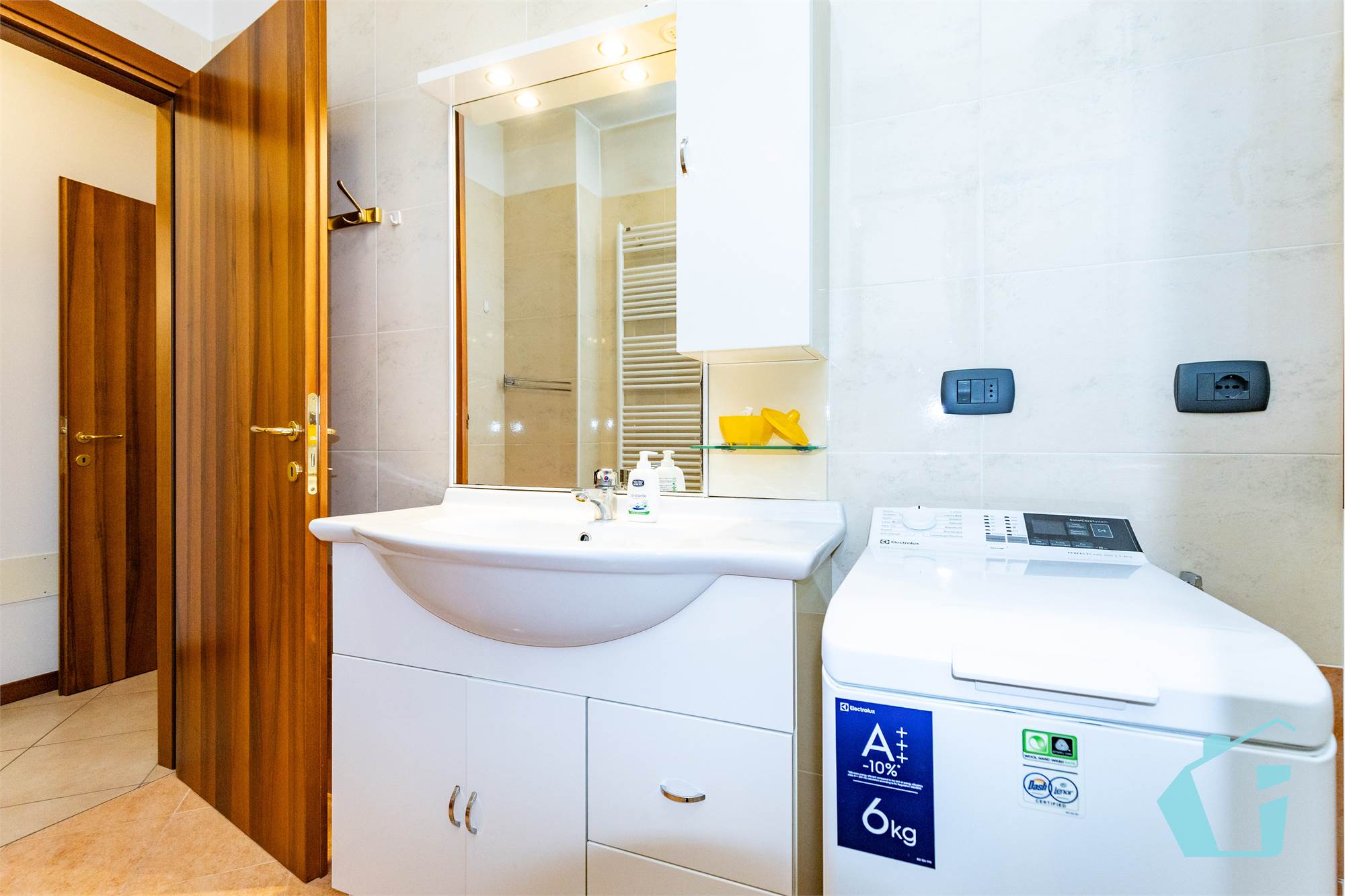 L'appartamento in questione è composto da ingresso, zona giorno living room con angolo cottura con poggiolo, camera matrimoniale con altro poggiolo, camera singola, bagno. Al piano interrato ampio garage dove si può parcheggiare tranquillamente un SUV. Internamente così come esternamente l'appartamento si presenta in ottime condizioni. Come finiture troviamo: portoncino blindato, aria condizionata, videocitofono, finestre in legno vetrocamera, zanzariere, tenda da sole nella terrazza del soggiorno esposta a sud; pavimentazione in gress porcellanato in zona giorno e parquet in legno nelle camere.