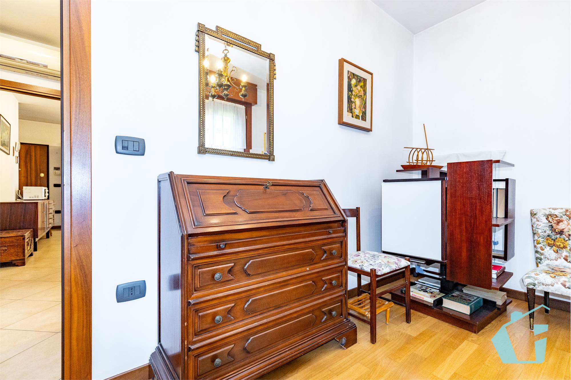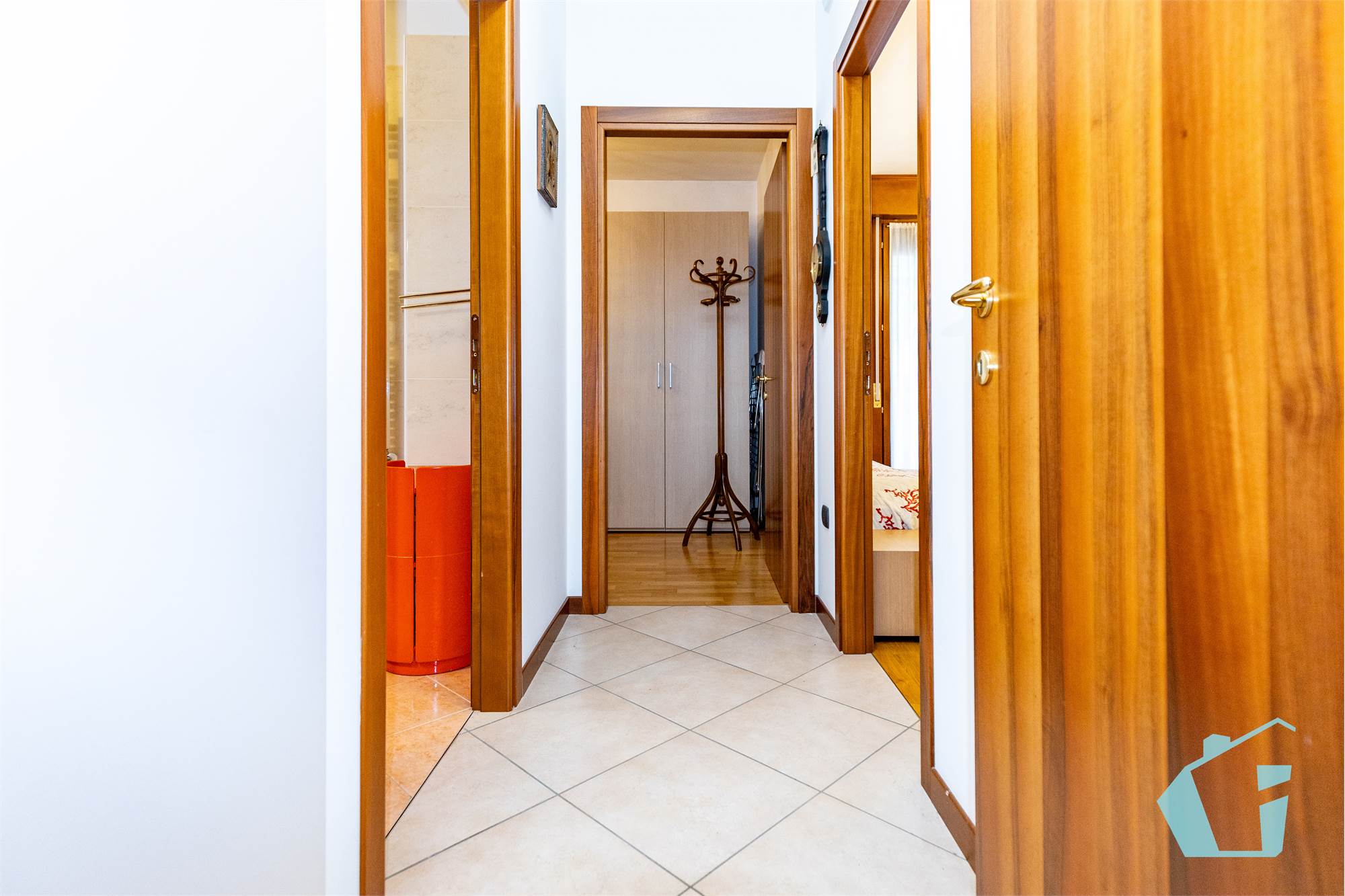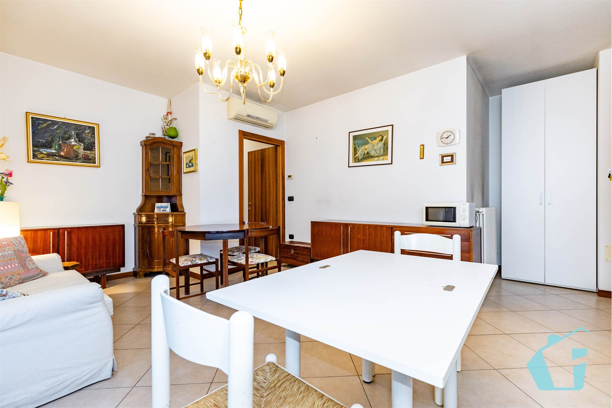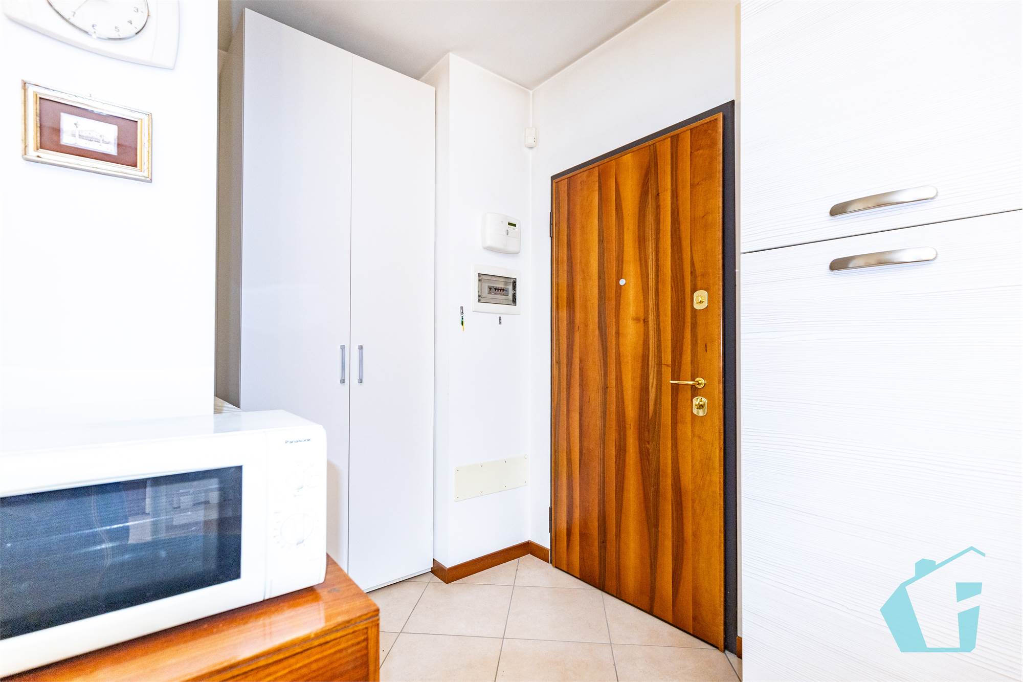 L'appartamento in questione è composto da ingresso, zona giorno living room con angolo cottura con poggiolo, camera matrimoniale con altro poggiolo, camera singola, bagno. Al piano interrato ampio garage dove si può parcheggiare tranquillamente un SUV. Internamente così come esternamente l'appartamento si presenta in ottime condizioni. Come finiture troviamo: portoncino blindato, aria condizionata, videocitofono, finestre in legno vetrocamera, zanzariere, tenda da sole nella terrazza del soggiorno esposta a sud; pavimentazione in gress porcellanato in zona giorno e parquet in legno nelle camere.