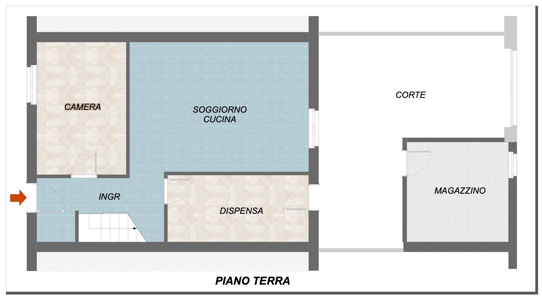 Internamente al piano terra abbiamo; una zona giorno di circa 27 mq composta da ampio cucinotto diviso dal soggiorno, una stanza da adibire a seconda camera o studio di 10 mq; scala interna che porta al piano primo dove troviamo: camera matrimoniale, camera doppia e bagno padronale.