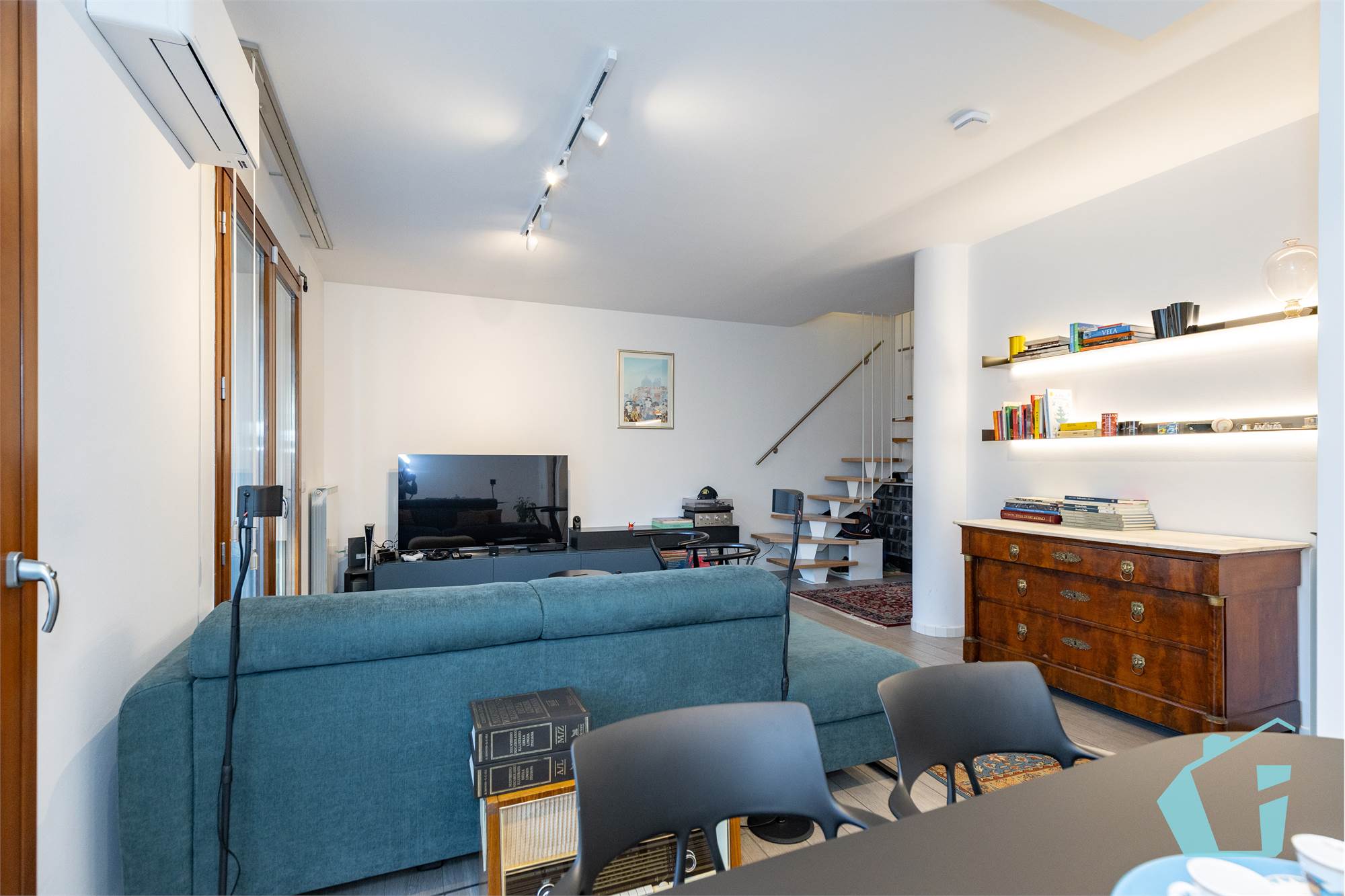 Mestre, Viale San Marco, splendido appartamento IN DUPLEX su contesto del 2007 al 1° ed ultimo piano. E' composto da ingresso, soggiorno con TERRAZZA ABITABILE con vista sul verde, ampia cucina di circa 17mq, bagno. Al 2° ed ultimo piano accatastato come sottotetto praticabile non abitabile abbiamo due stanze adibite a camere con un altro bagno. Al piano interrato enorme garage di 25 mq ideale per auto di qualsiasi dimensione. La palazzina è di recente costruzione con particolari accortezze a risparmio energetico, cappotto esterno, tetto ventilato, le finiture sono di ottimo livello, abbiamo pavimenti in gress al piano primo e parquet nel sottotetto, videocitofono, finestre in legno vetrocamera, tapparelle motorizzate, aria condizionata, zanzariere. Ottimo per giovani coppie o single. Contesto introvabile a ridosso del centro di Mestre!