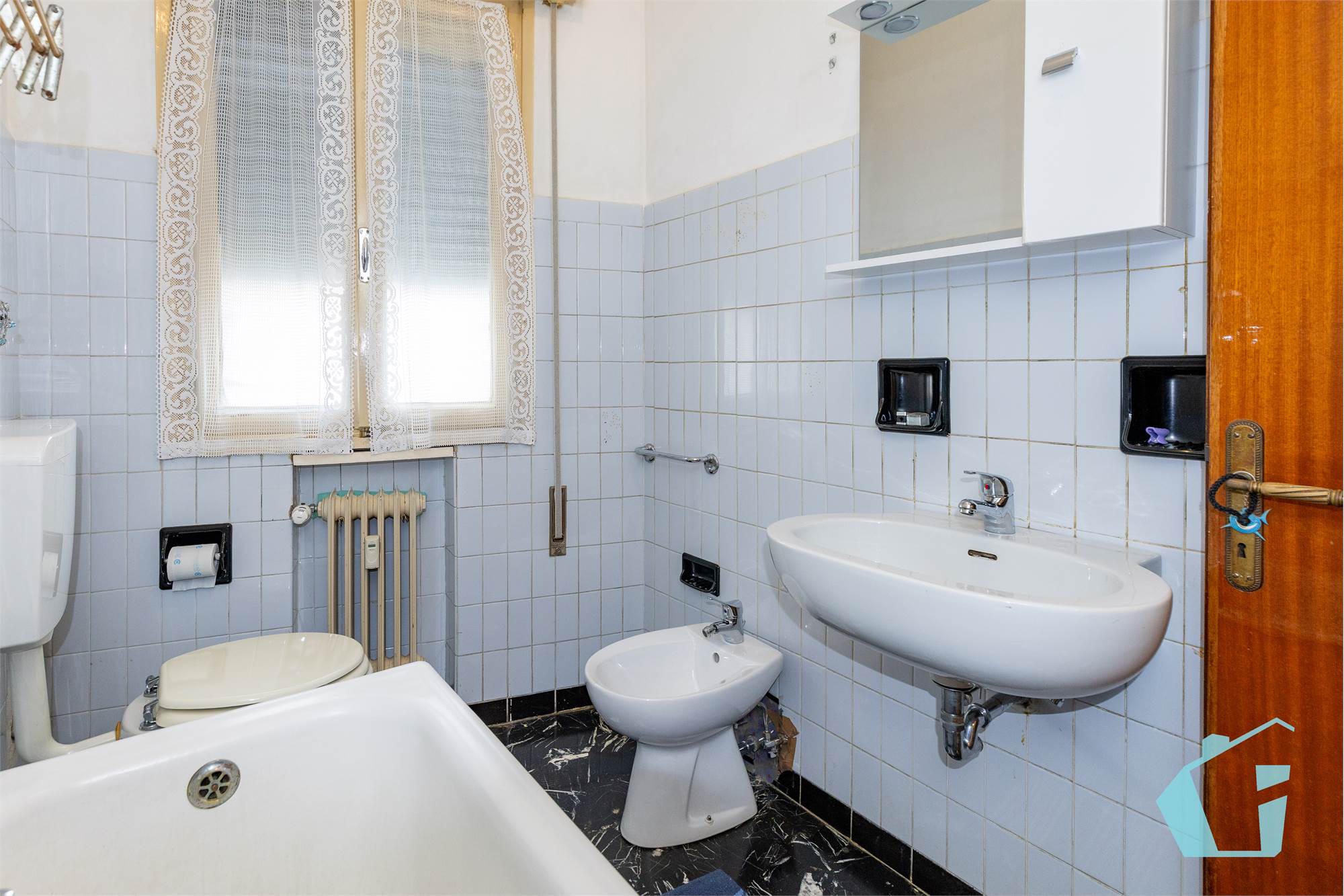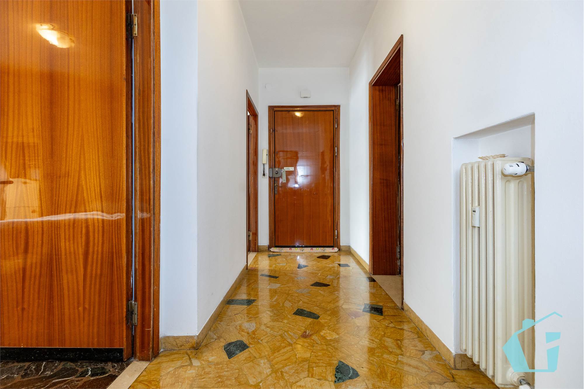 Internamente l'appartamento presenta sostanzialmente finiture dell'epoca con pavimentazione in marmo in palladiana, porte e finestre in legno.